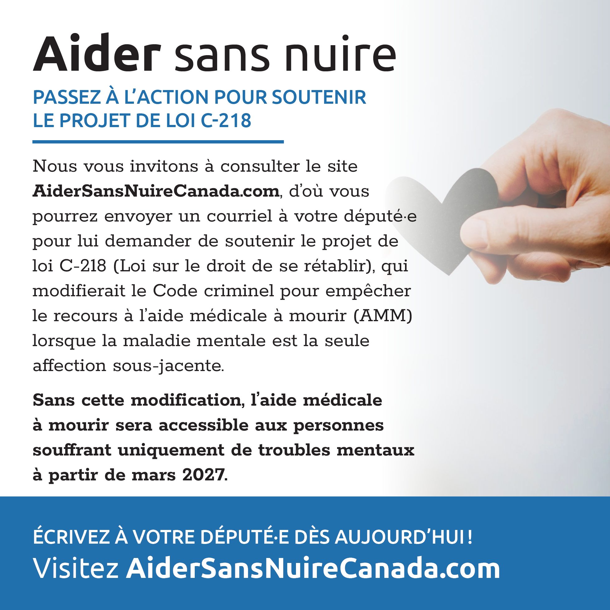 Chaque message envoyé fait une différence. En quelques minutes, vous pouvez demander à votre député·e d’appuyer ce projet de loi important. Pour participer, rendez-vous dès aujourd’hui sur le site aider sans nuire et ajoutez votre voix à celles qui veulent protéger la dignité et la vie des personnes les plus fragiles.