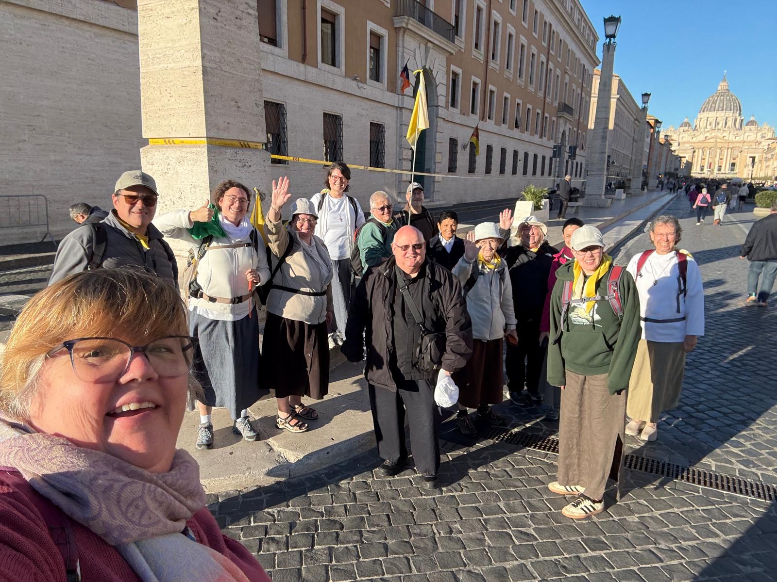 « J’ai quitté le Québec le 6 octobre dernier pour participer au Jubilé de la vie consacrée. Je suis avec un petit groupe de 14 personnes consacrées. Nous sommes trois membres de vie religieuse appartenant à deux communautés franciscaines différentes. D’autres membres viennent de communautés nouvelles, notamment du Mouvement des Brebis de Jésus et de Marie Jeunesse. Il y a également deux membres d’instituts séculiers et deux prêtres : un capucin et un rédemptoriste.