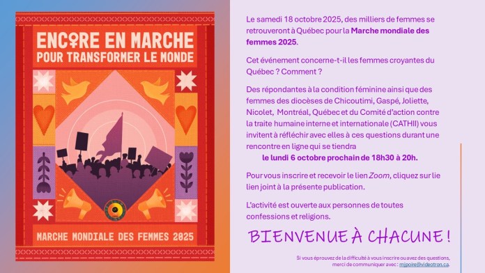 Le samedi 18 octobre 2025, des milliers de femmes se retrouveront à Québec pour la Marche mondiale des femmes, un événement porteur d’espoir et de changement, sous le thème « Encore en marche pour transformer le monde ».